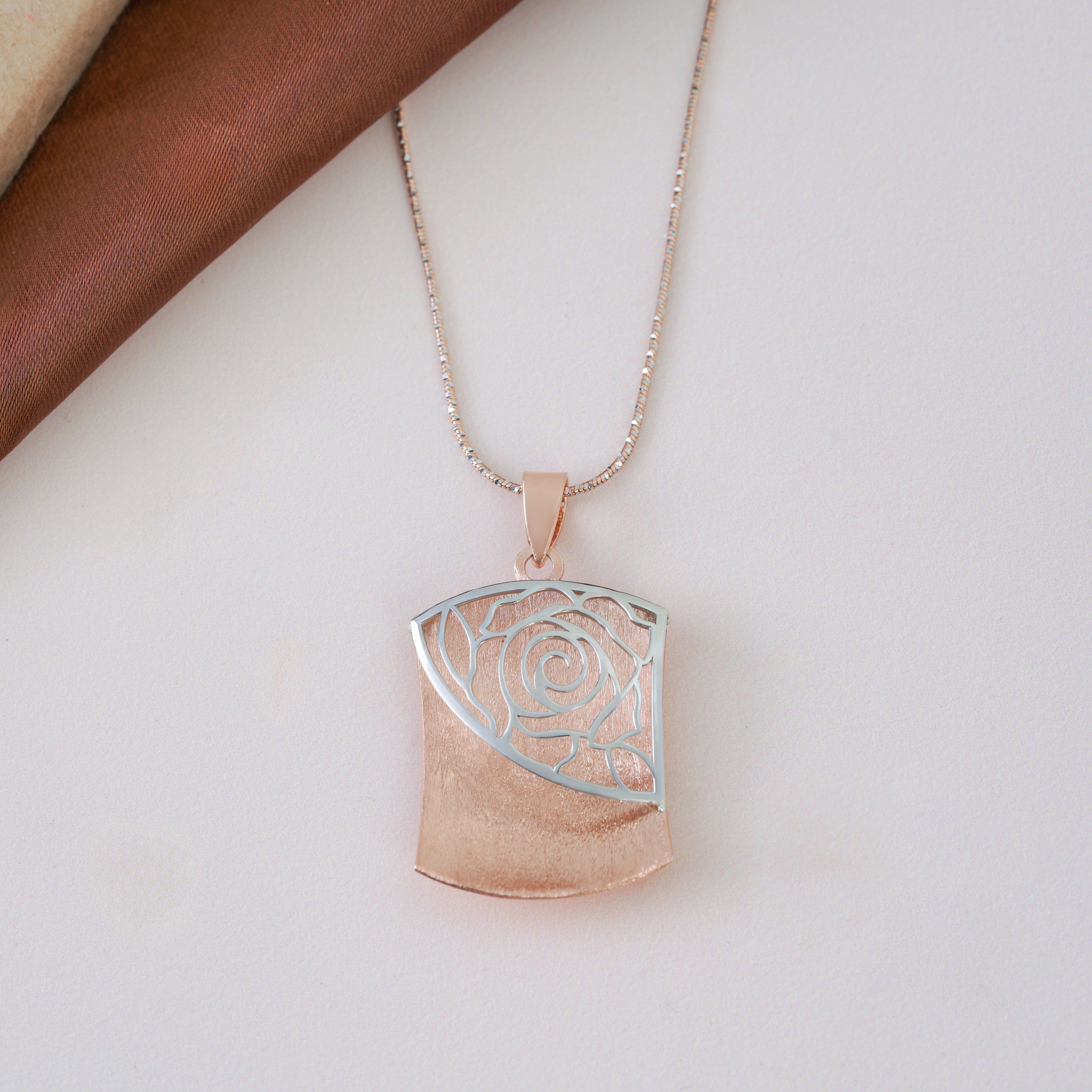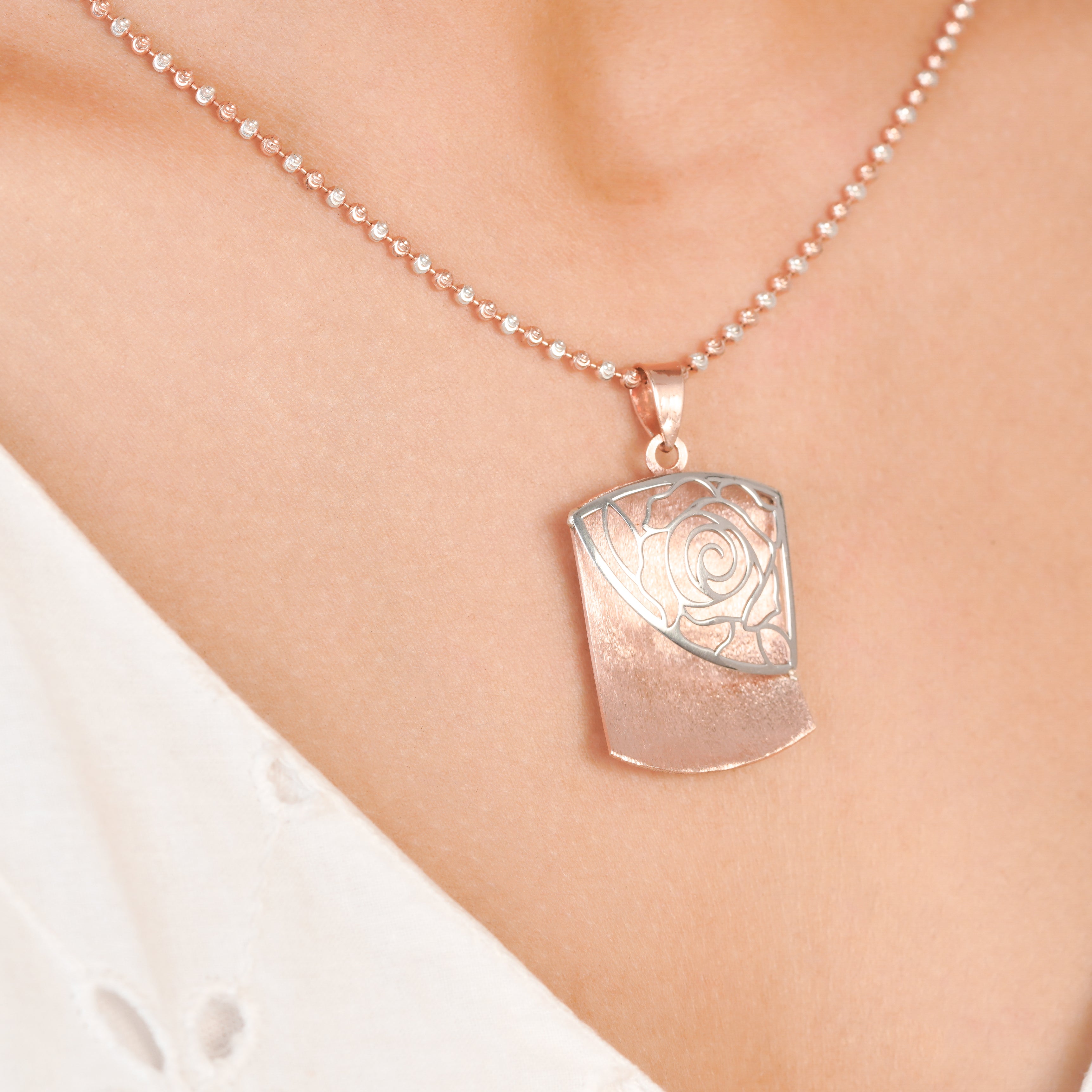 The Intricate Quad Rose Gold Necklace from Kiorah is designed for the woman who cherishes elegance. Made with 925 sterling silver and featuring a luxurious rose gold finish, this ornate piece stands out with its distinctive curved rectangular pendant, adorned with a striking floral design. The intricate rose motif is set against a soft backdrop of rose gold. The matte finish of the rose motif adds depth and texture, contrasting beautifully with the polished background in this piece of rose gold jewelry. The minimalistic charm of the chain complements the pendant's ornate design and creates a harmonious balance.
