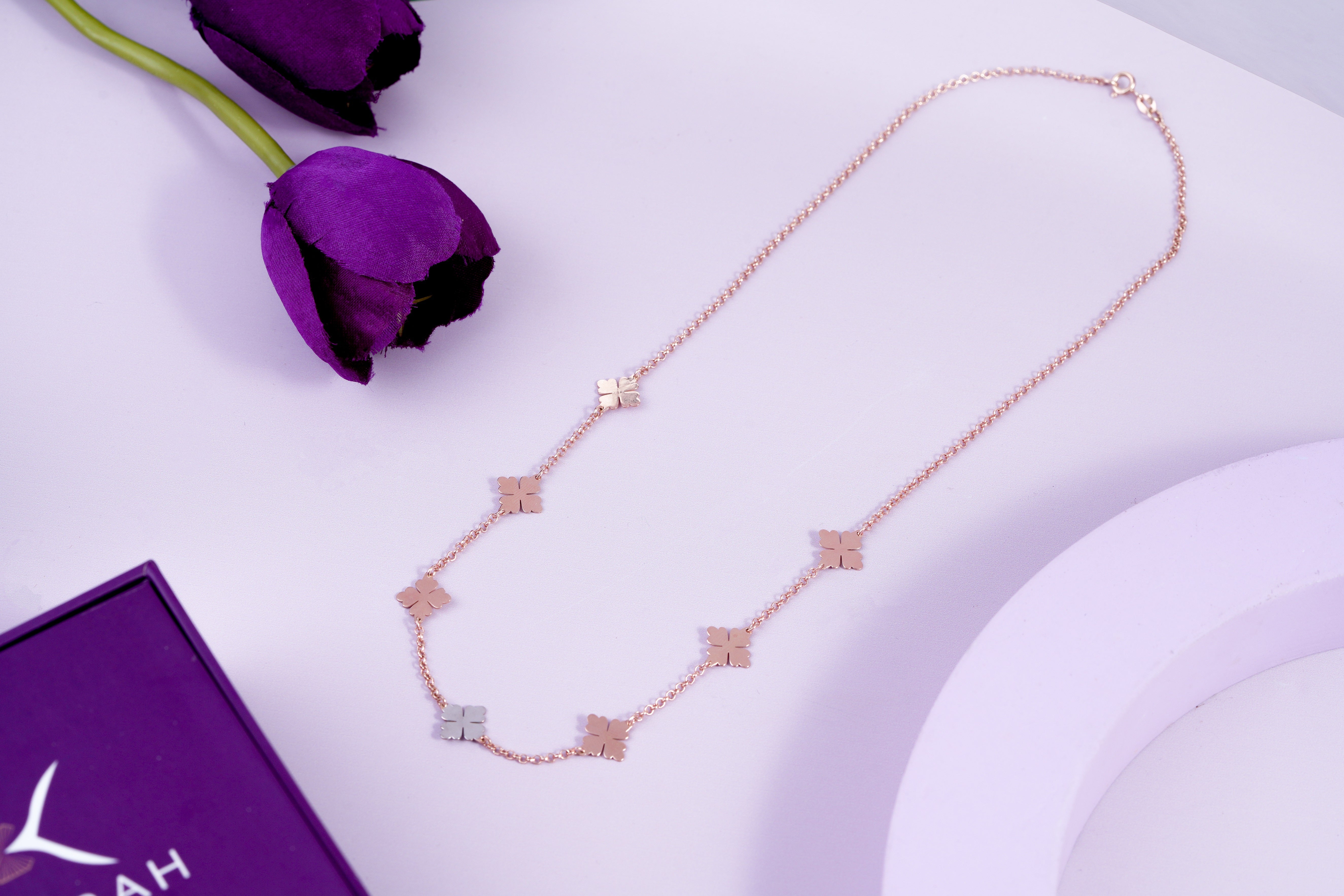 Experience the magic of Kiorah's Italian Luxury Design 925 Sterling Silver Necklace, a masterpiece crafted for those who appreciate the art of timeless sophistication. Carefully handcrafted with love, this necklace captures the essence of Italian craftsmanship and features evenly spaced four-petal floral motifs, each polished to a sleek finish that subtly catches the light. The charms - rose gold with silver at the center - add gentle contrast and depth, enhancing the elegant necklace design. Made from genuine 925 sterling silver and weighing just 4.90 grams, its radiant finish shimmers with every movement, elevating your style with ease.