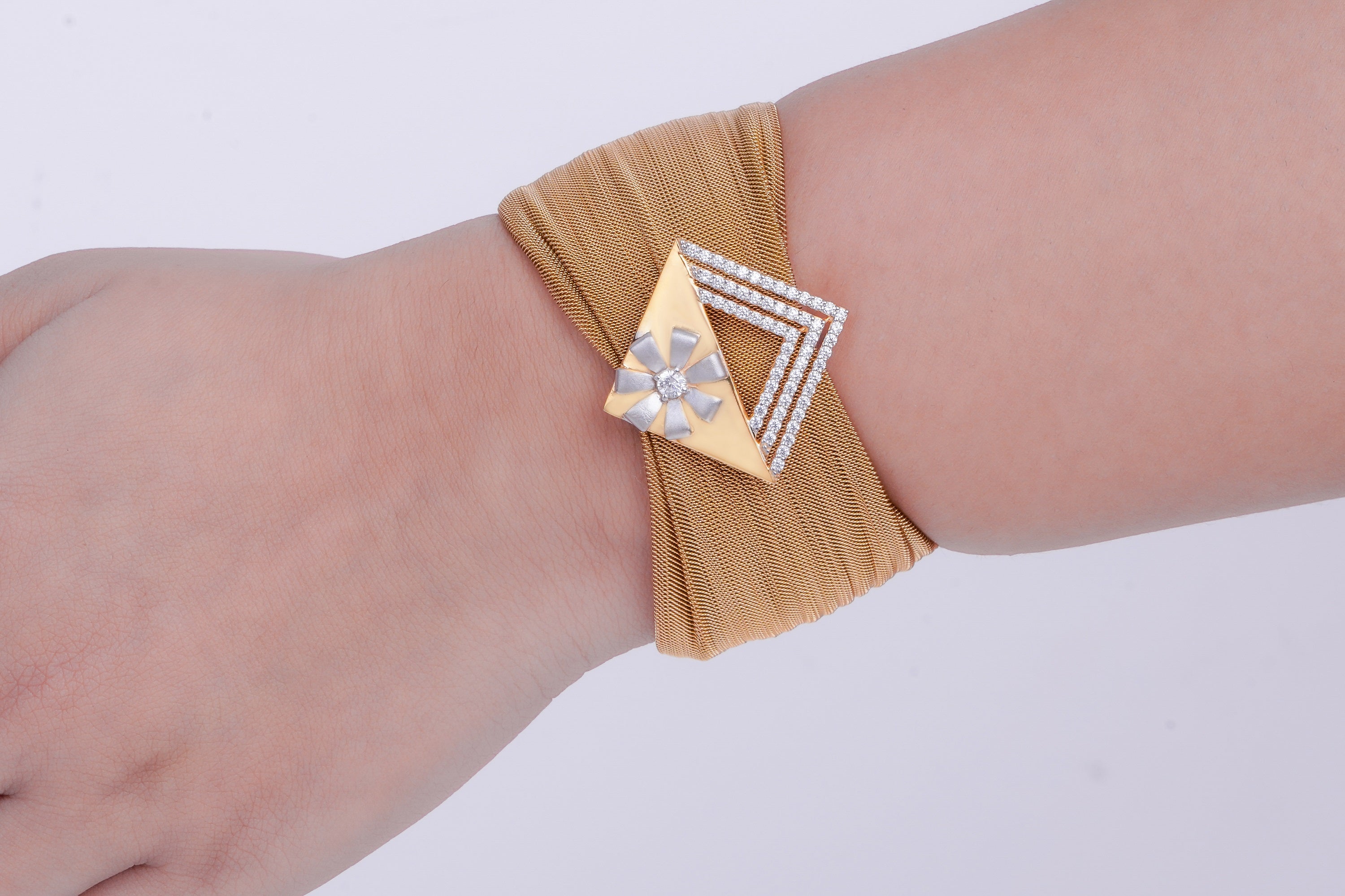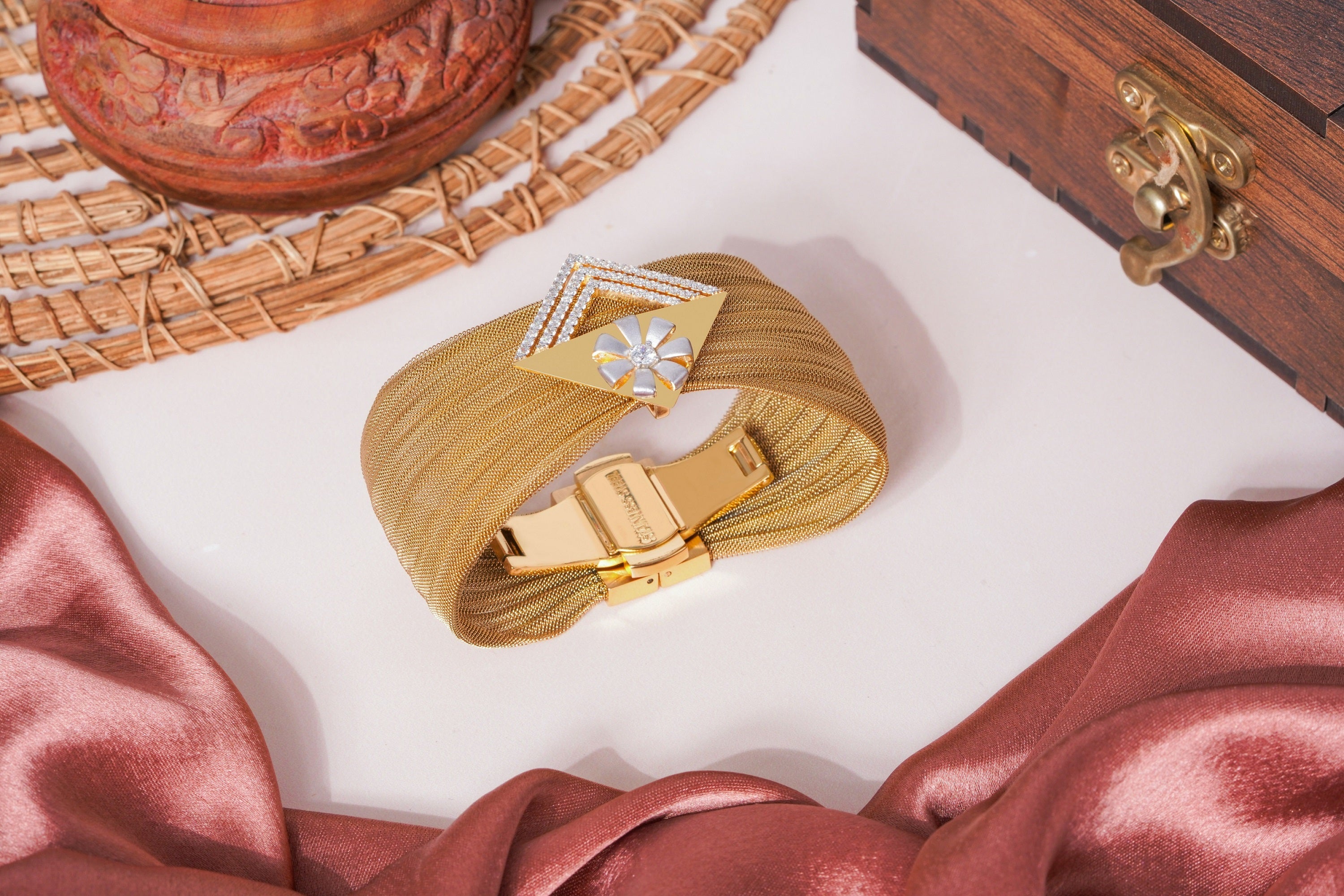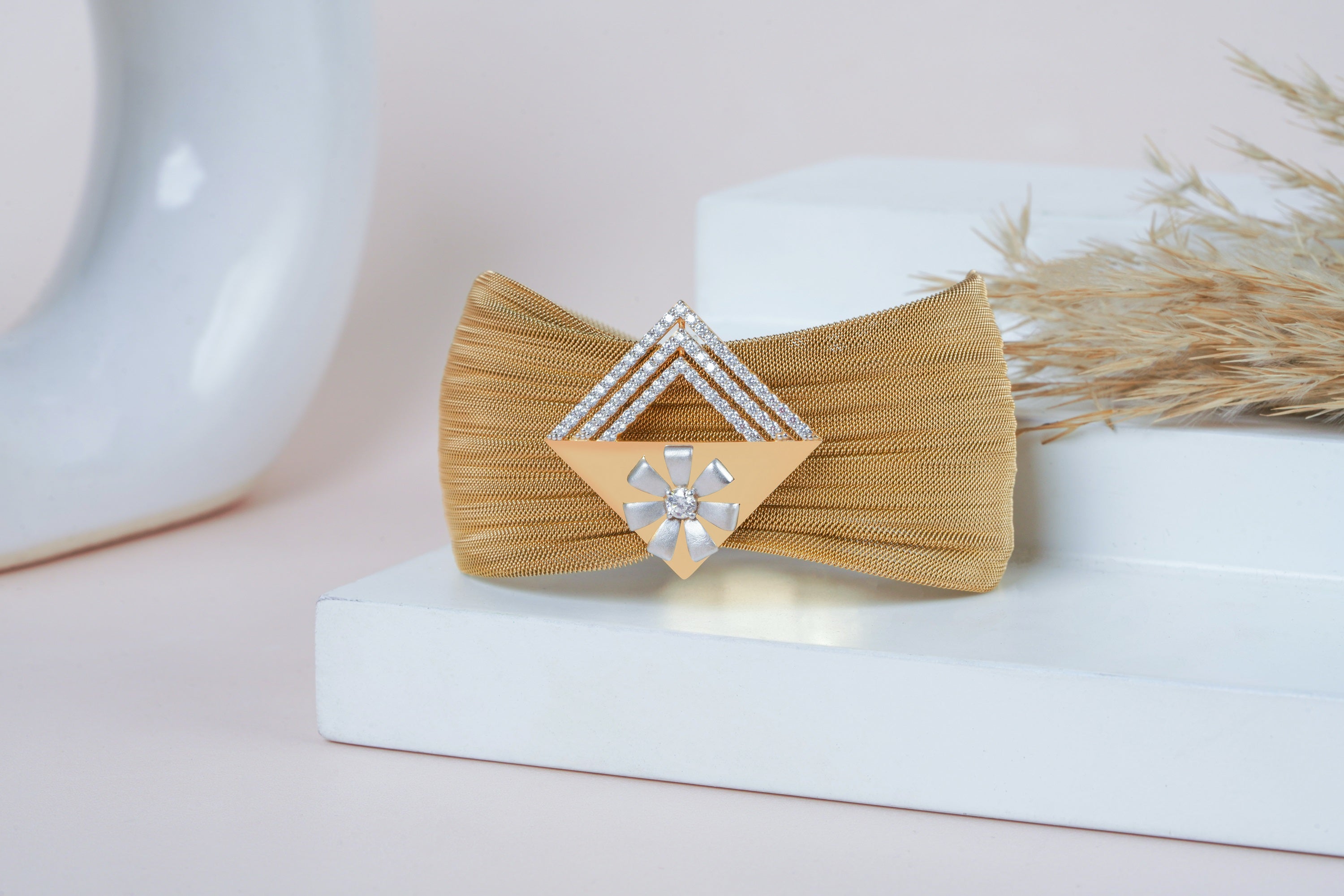 Make a bold statement with this Elegant Rose Gold Mesh Bracelet, crafted in 925 Silver (6.00g). Featuring a striking geometric design with dazzling cubic zirconia embellishments, this piece exudes contemporary luxury. The intricate mesh texture and contrasting silver floral motif add a unique touch, making it a must-have for modern jewelry lovers.